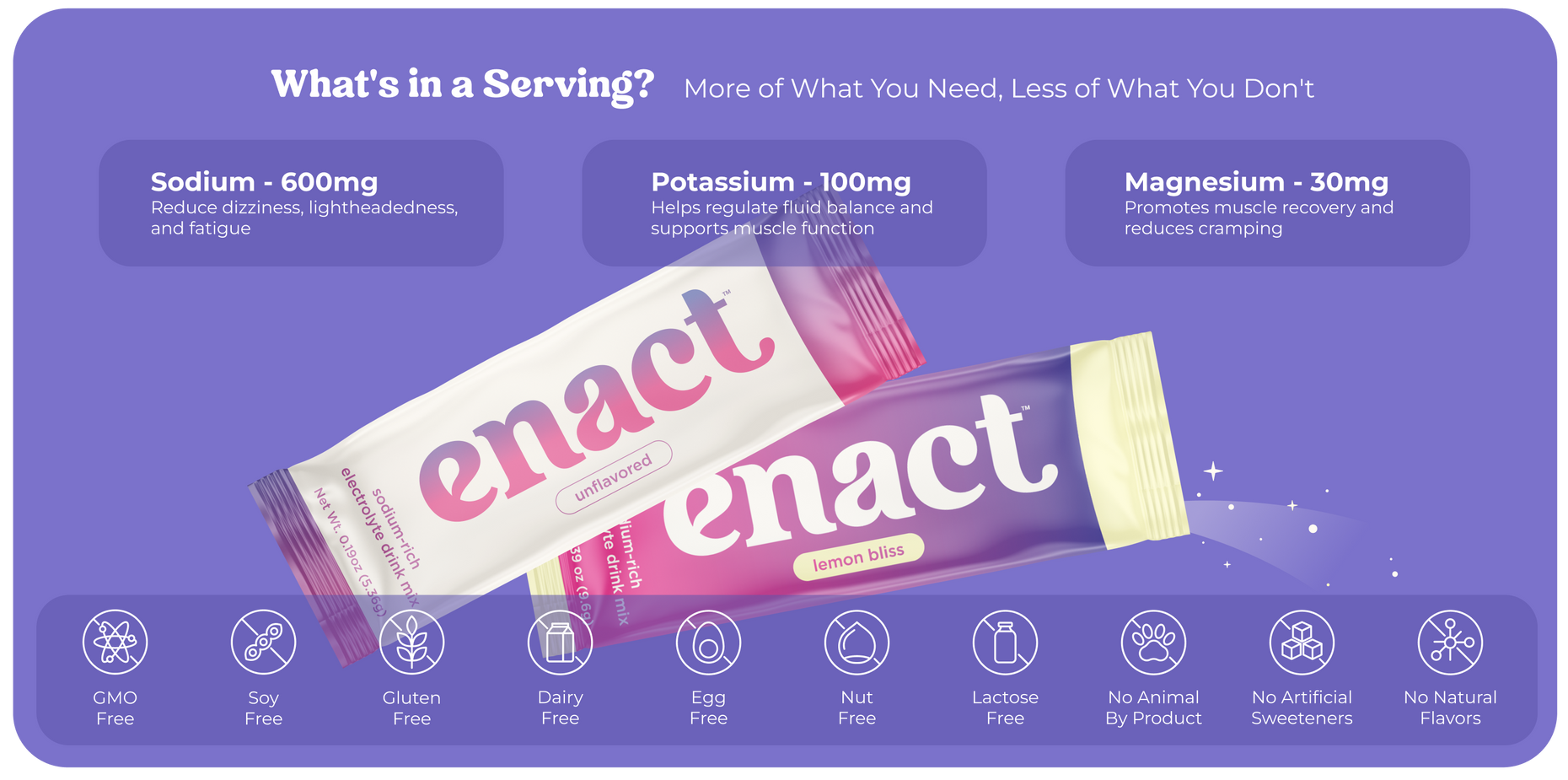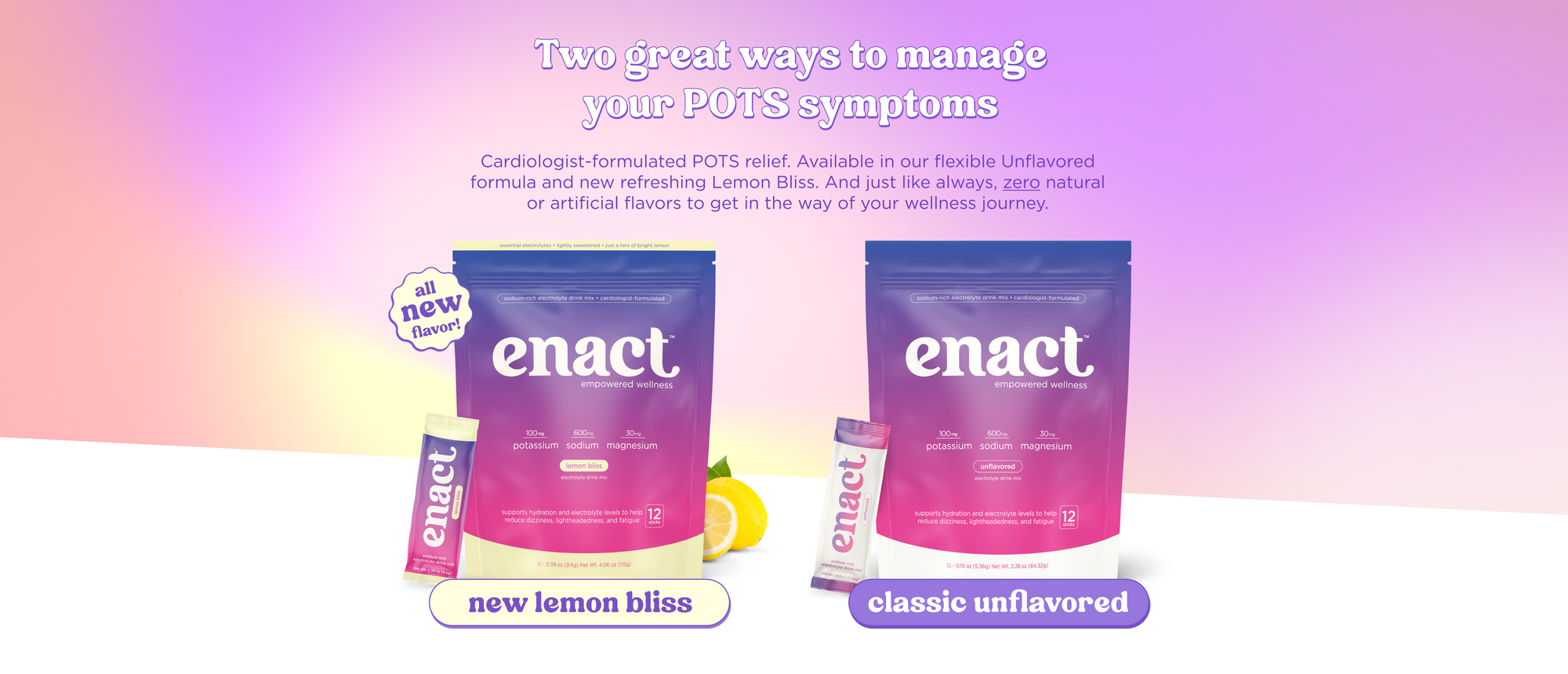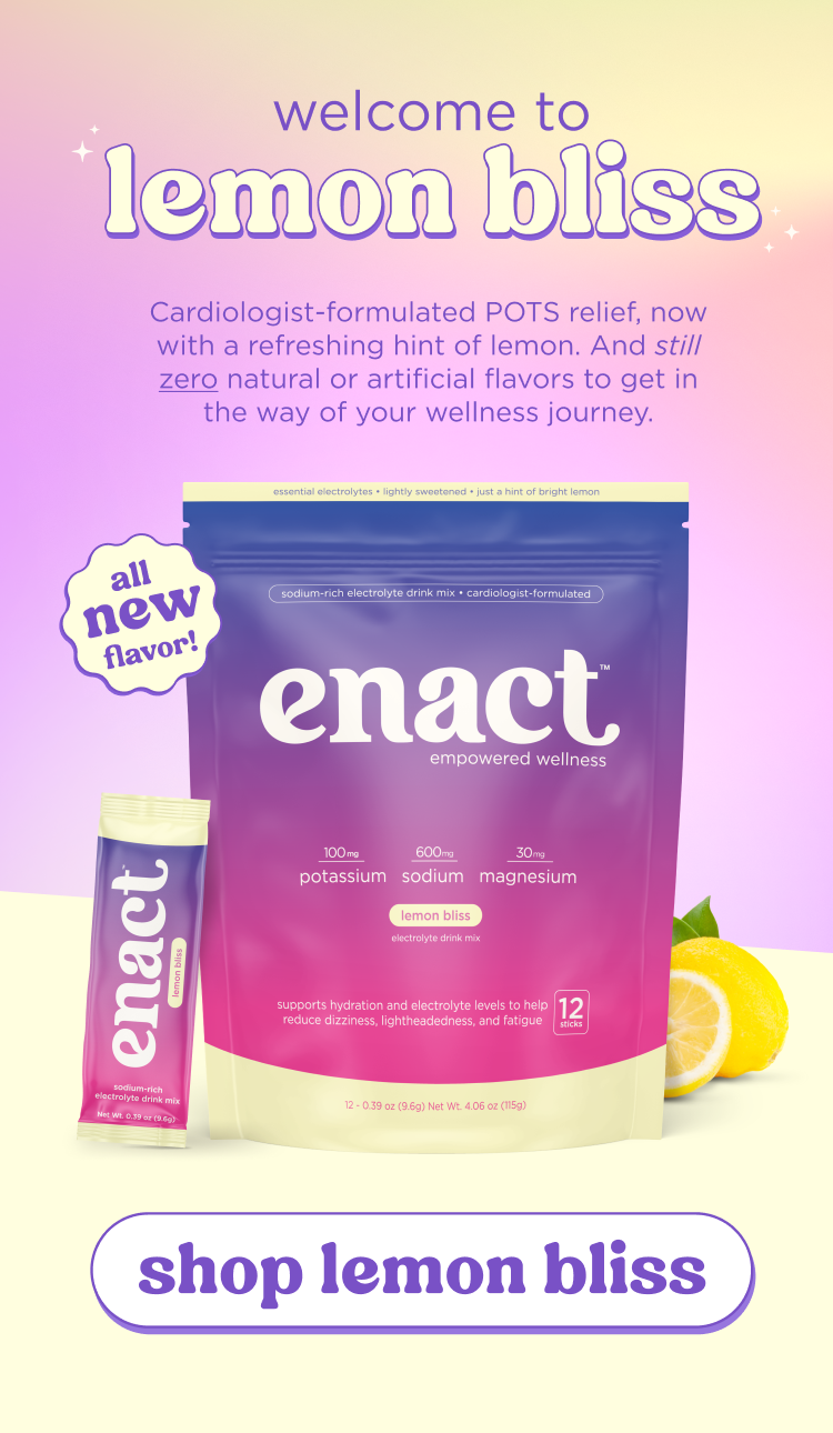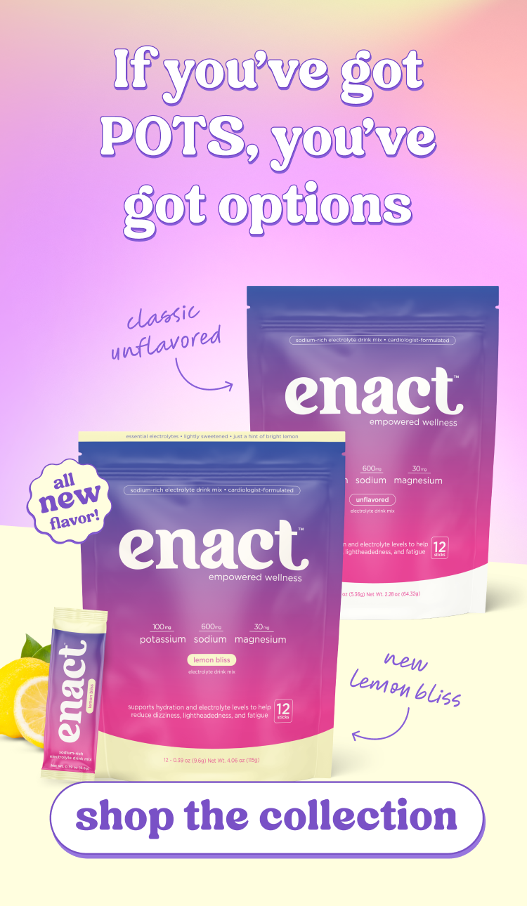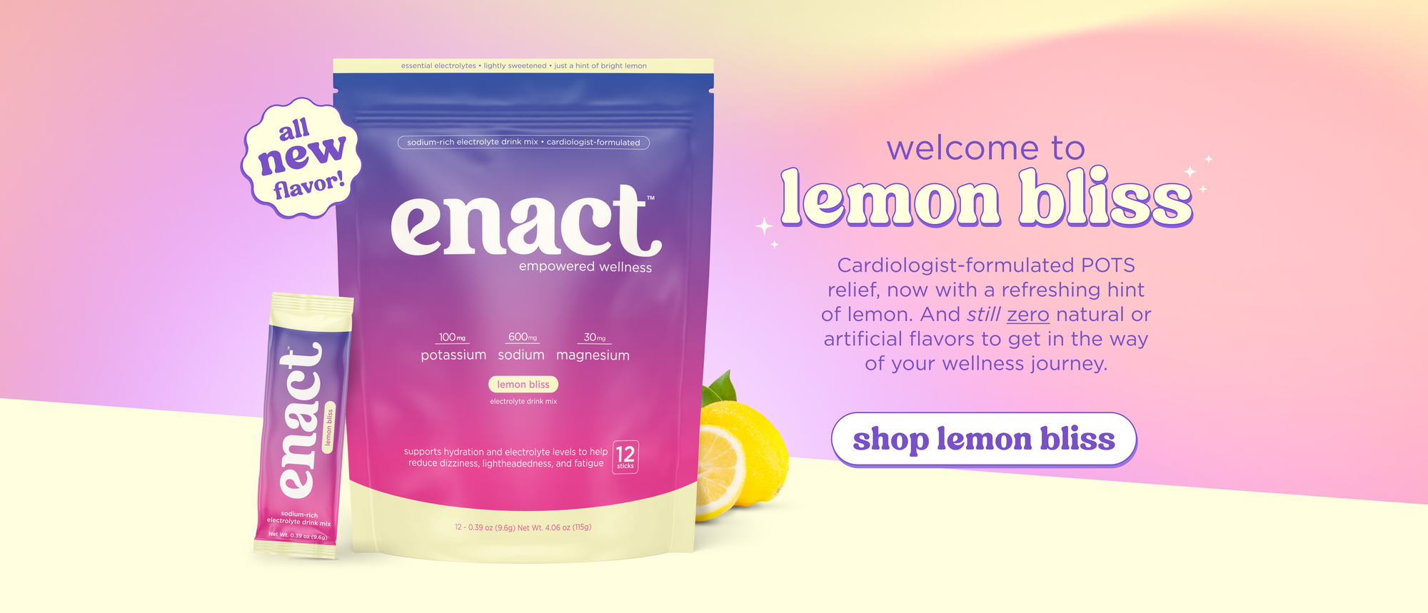 Enact is specially designed for people affected by POTS, a form of dysautonomia where standing triggers a rapid rise in heart rate that can cause dizziness, lightheadedness, fainting, and fatigue, making everyday activities difficult.Developed by cardiologist Dr. Christopher Kelly, Enact delivers a precise balance of sodium, potassium, and magnesium to support circulation, muscle function, and hydration. By helping increase sodium levels, Enact can ease dizziness and fatigue and may reduce the frequency of POTS symptoms with regular use.